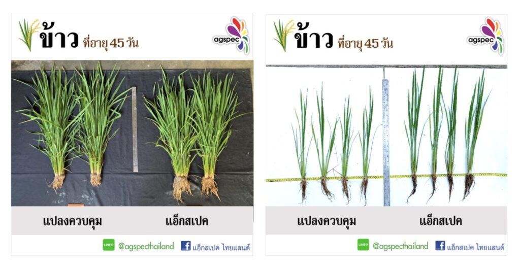 อายุข้าวที่ 45 วัน : พบว่าต้นข้าวและใบข้าวแข็งตั้งตรง ช่วยให้ใบเขียวได้เร็วและนานกว่าแปลงควบคุม รวมถึง ช่วยให้มีการสร้างรากใหม่ รากหนา และแข็งแรง ทำให้ต้นข้าวตอบสนองต่อปุ๋ยได้ดี