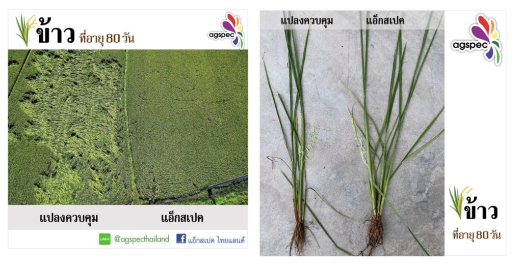 อายุข้าวที่ 80 วัน : พบว่าต้นข้าวมีจำนวนใบมากขึ้น ใบเขียวนานกว่า เพื่อการสร้างอาหารและสะสมอาหารในเมล็ดข้าว ข้าวมีลำต้นแข็งแรง ลำใหญ่ ต้นไม่ล้ม หรือหักงอเมื่อได้รับแรงกระแทกจากลม และฝน ช่วยลดการสูญเสียผลผลิตขณะเก็บเกี่ยว อีกทั้งยังพบว่าข้าวออกรวงสม่ำเสมอ รวงสมบูรณ์ และมีน้ำหนักดี